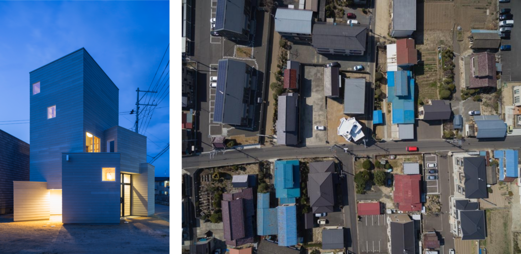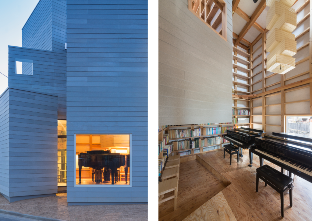 この自邸は、スケールの異なる9つのキューブの組み合わせによって成り立っている。外から見れば、それぞれのボリュームは独立しながら、わずかに角度を振って噛み合い、ひとつのまとまりをつくっている。正面では二つのキューブの隙間がエントランスとなり、北東側には母が営む音楽教室の大きな開口が街に向かって開く。そこからはレッスン中の気配がふと垣間見え、住宅の内部は閉じた私的領域としてではなく、周辺の環境ににじみ出す風景として現れる。9つのキューブは、単純な箱の集合ではない。それぞれが独立した箱である以前に、内外の関係を編み直すための空間の単位として配置されている。