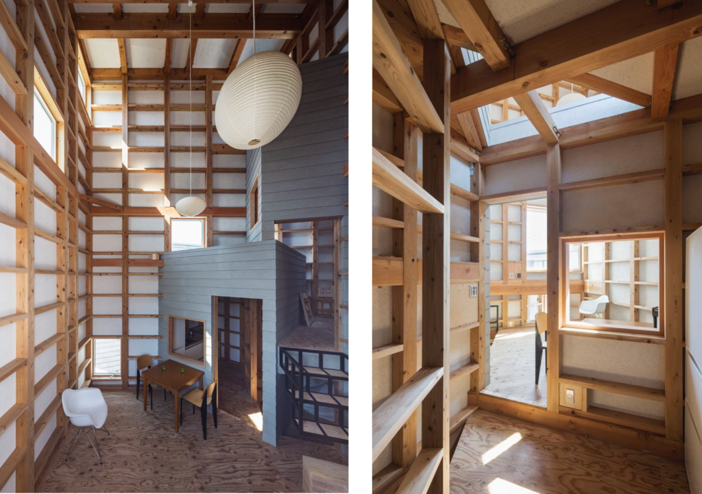この住宅で目指したのは、完成されたインテリアを整えることではなく、更新され続けることのできる「躯体」を立ち上げることでもあった。内部では木造在来工法の軸組を現しとし、仕上げ材は極力抑えられている。自邸だからこそ、自分が今後も手を加え、住みながら更新し続けられる状態だけを躯体として出現させ、その「躯体に住まう」ことが目指されていた。将来的には、隣地にある自身のアパートメントと関係づけながら、分棟のキューブを増築し、機能をシェアすることも想定されている。バスルームやトイレが外部からもアプローチしやすい位置に置かれていることや、母が営む音楽教室に地域の子どもたちが訪れることも含め、この住宅は閉じた家ではなく、周辺に開かれた環境の核として構想されている。つまり[home]は、住宅の内部だけで閉じるものではなく、敷地や周辺との関係のなかでも育っていくものだ。