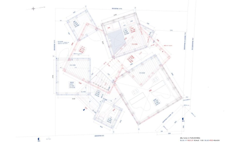 福島に自邸を建てるという行為は、私にとって単に住まいを得ることではなかった。敷地は福島県福島市、東日本大震災の半年後に火災に遭い、更地となった実家の土地である。その場所には、震災後の地震被害や放射能汚染の問題、さらに祖母の他界といった、否応なく突き付けられたいくつもの現実が重なっていた。そうしたネガティブなコンテクストを抱えた土地に、建築家として何を立ち上げるのか。福島という土地の未来、自分自身の将来、そして家族の生活のあり方に対して、少しでも開かれた建築は可能なのか。その問いから、この住宅の構想は始まっている。
