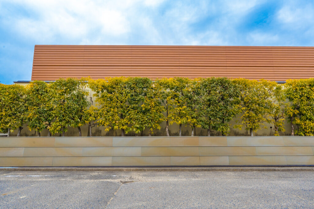 こうした素材としての可能性に目を向けると、鶴弥の陶板壁材「スーパートライWall」は興味深い。鶴弥はこの製品を、瓦づくりで培った技術と焼き物の魅力を生かして生まれた新しい壁材と位置づけており、瓦と同じ自然素材の粘土を1130℃の窯で焼き締めた、陶器の強さと美しさをもつ壁材だとしている。また、1,810mm×303mmの大判サイズで、屋内外を問わず使用できることも特徴として掲げている。つまりこれは、瓦をそのまま壁に転用したものではなく、瓦の技術を壁のスケールと用途に移し替えることで、「陶」という素材を境界面として再定義したものだといえる。
