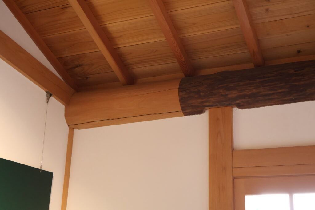 傷んでしまったところは切り落とし、使える部分のみを再利用をしている。出入り口付近の梁はこのように新旧が隣接している。